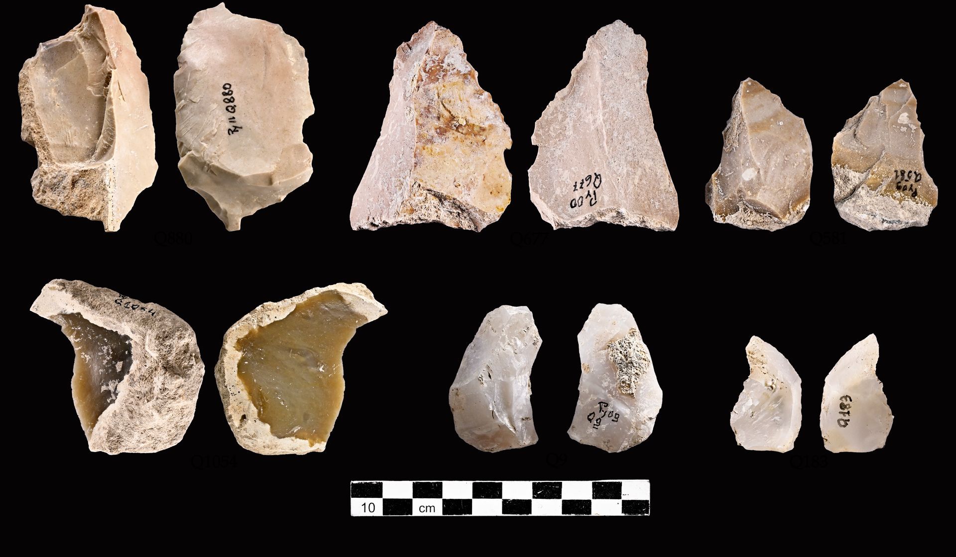 Another recurring evidence of the Levallois exploitation system is the detachment of a preferential cortical core flake, that, like nos. Q686, Q1056, Q1052, Q499, e Q1055, was often reused as centripetal scraper thanks to the jagged and denticulate edges left by the progressive around detachment.