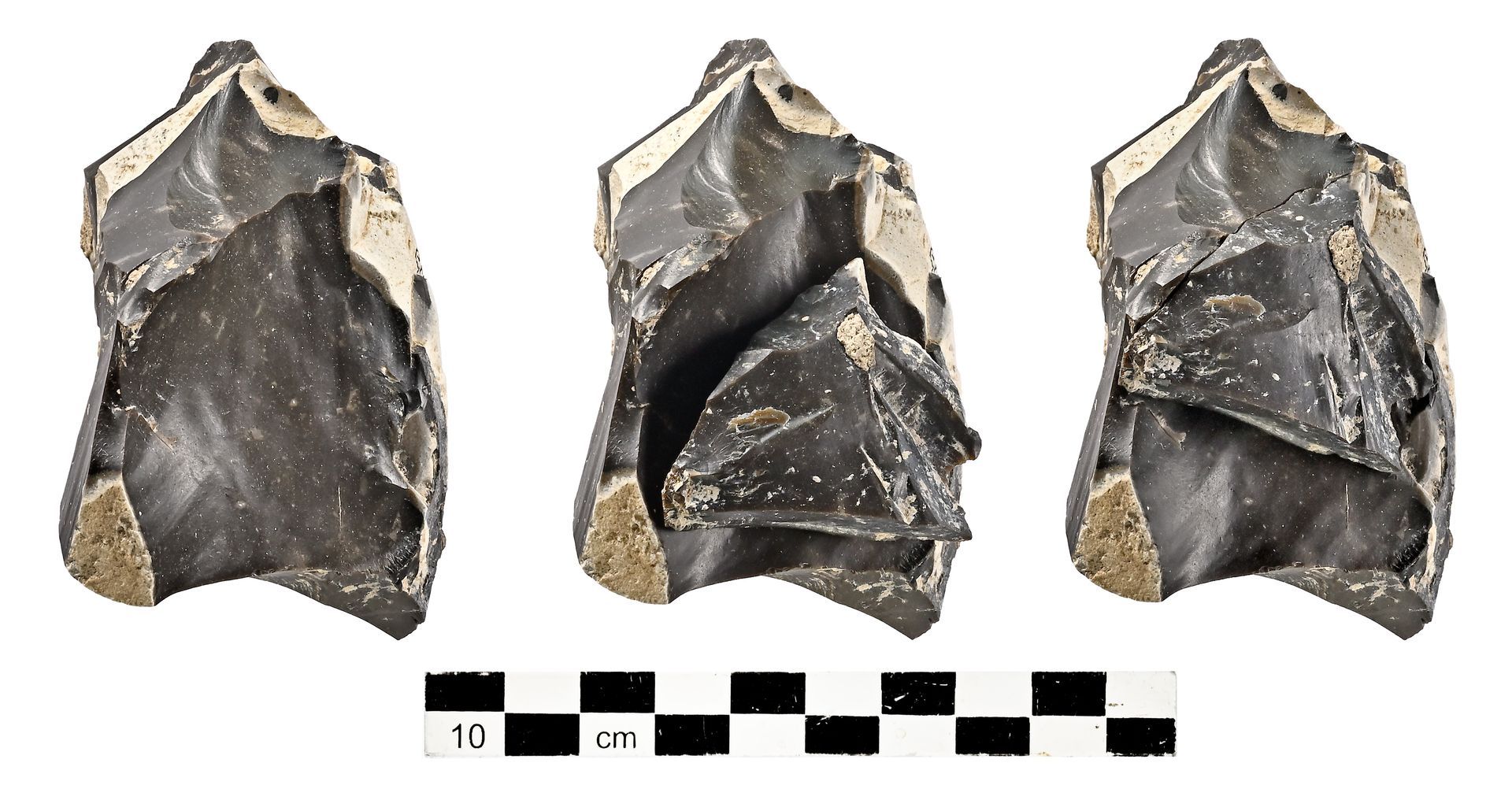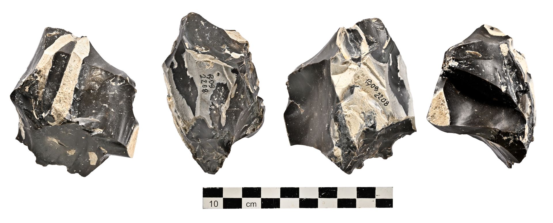 - Core no. Q1043, weighing 890 grammes, is the largest flint specimen discovered in the site, providing educational information on the entire core preparation process and its subsequent circular exploitation in the production of flakes used as points, scrapers, blades, and backed knives. The two opposing, almost parallel platforms both preserve the cortex in the central portion corresponding to the distal and proximal parts of the core, while in the proximal area opposite the pyramidal apex, a large convex detachment of a preferential flake with a cortical back and a naturally serrated edge is evident. Furthermore, the perfectly preserved patina suggests that the core was not reused in later periods.
